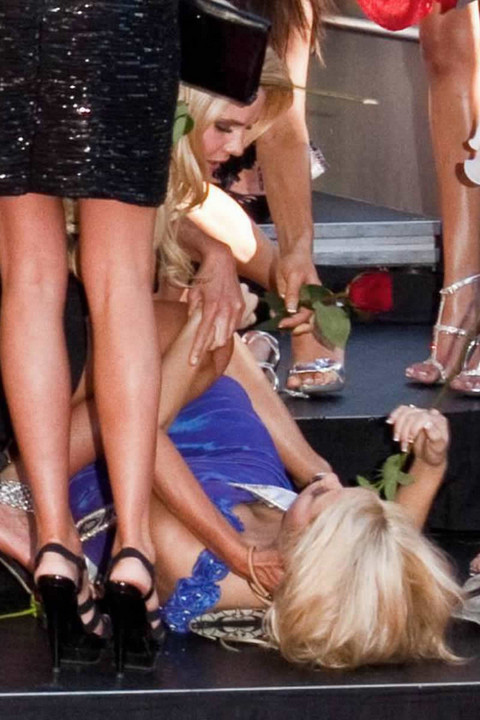 The Miss USA Pageant rolled out the red carpet for the annual beauty competition at Planet Hollywood Miss Kentucky, Kindra Danielle Clark took a stage dive while making her grand entrance Local "entertainment reporter" Alicia Jacobs pretends to be in shock at the site of the beauty queens collapse Then seems to be thinking about her boyfriend... Eventually, as any good reporter, she finds the strength to just laugh it off- the show must go on you know.